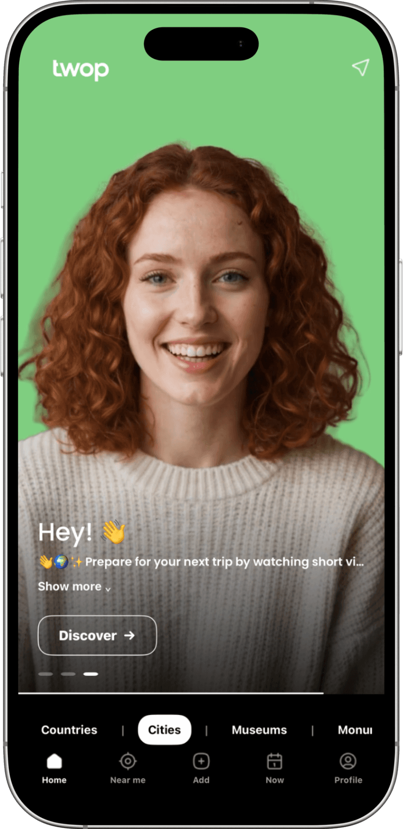 Si eres guía turístico y tu negocio depende de las horas que puedes atender grupos, aquí encajas. En TWOP conviertes tu conocimiento en vídeo corto, llegas a más perfiles de viajeros y tu contenido sigue activo en el tiempo. Además, puedes generar ingresos cuando te reserven como guía o activen tus rutas, tours y experiencias desde tus vídeos.