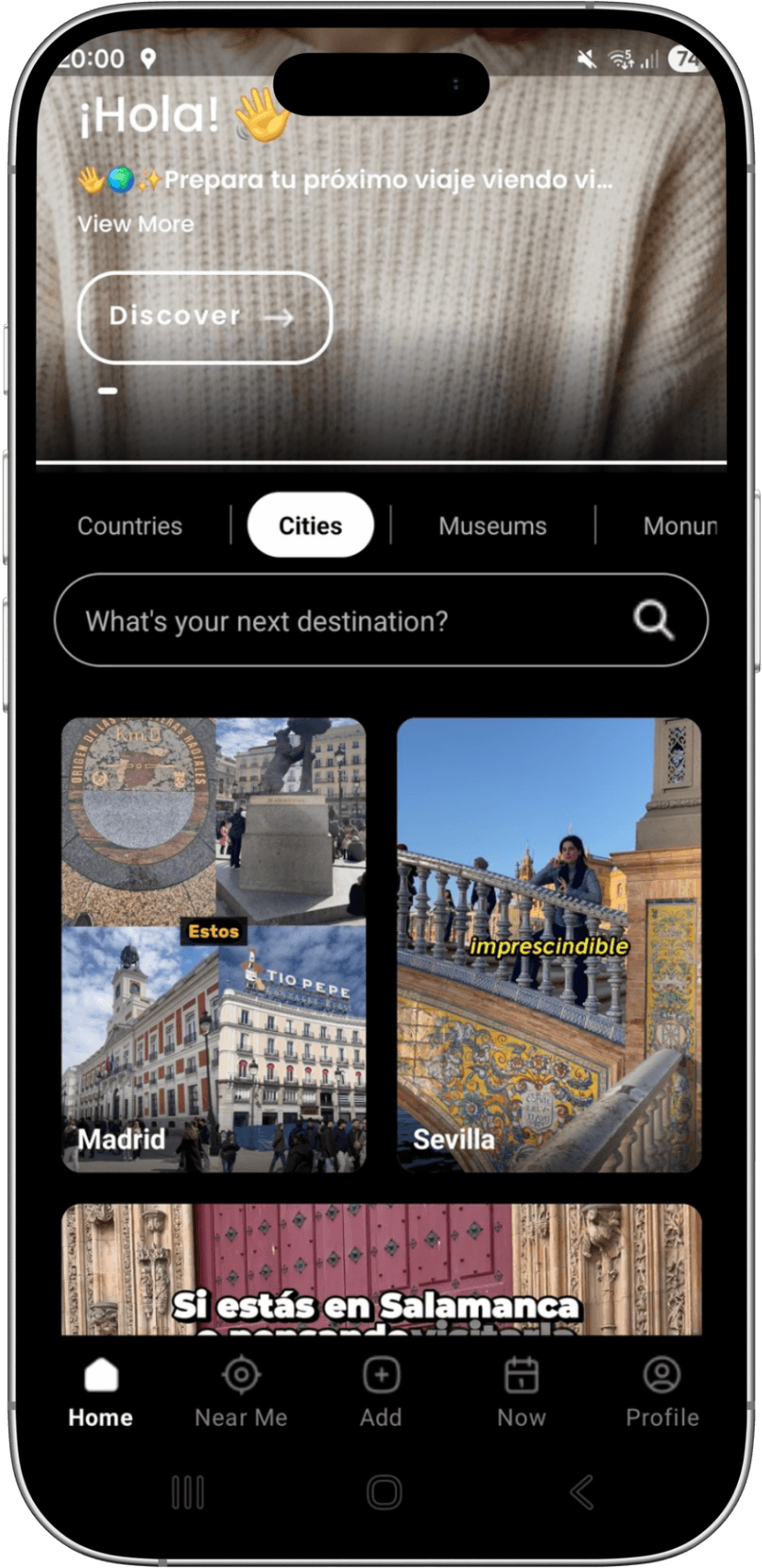 Desde las portadas accede directamente al feed de vídeos: al entrar en una ciudad, verá todo tu contenido reunido en un solo lugar, listo para guardar y planificar.