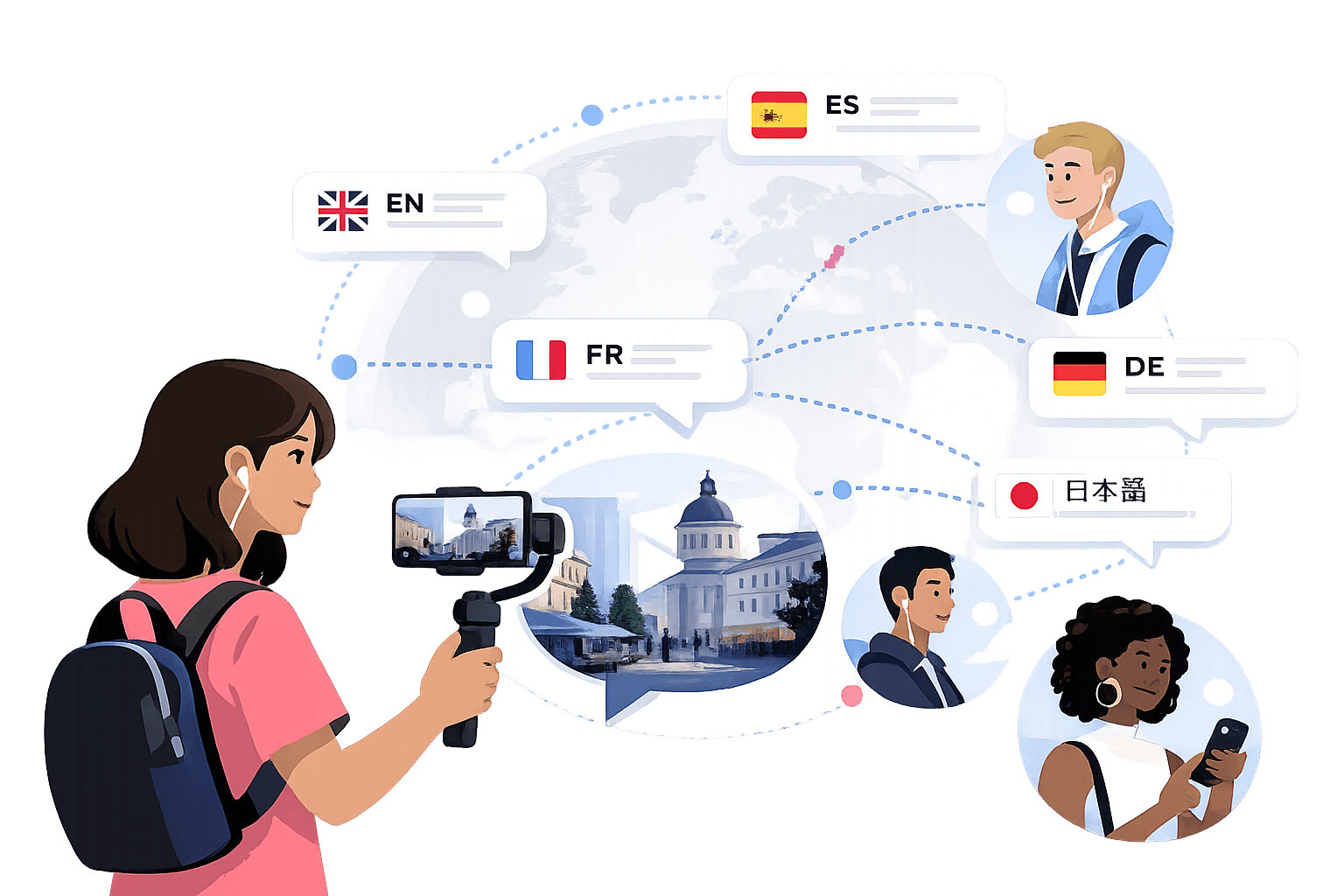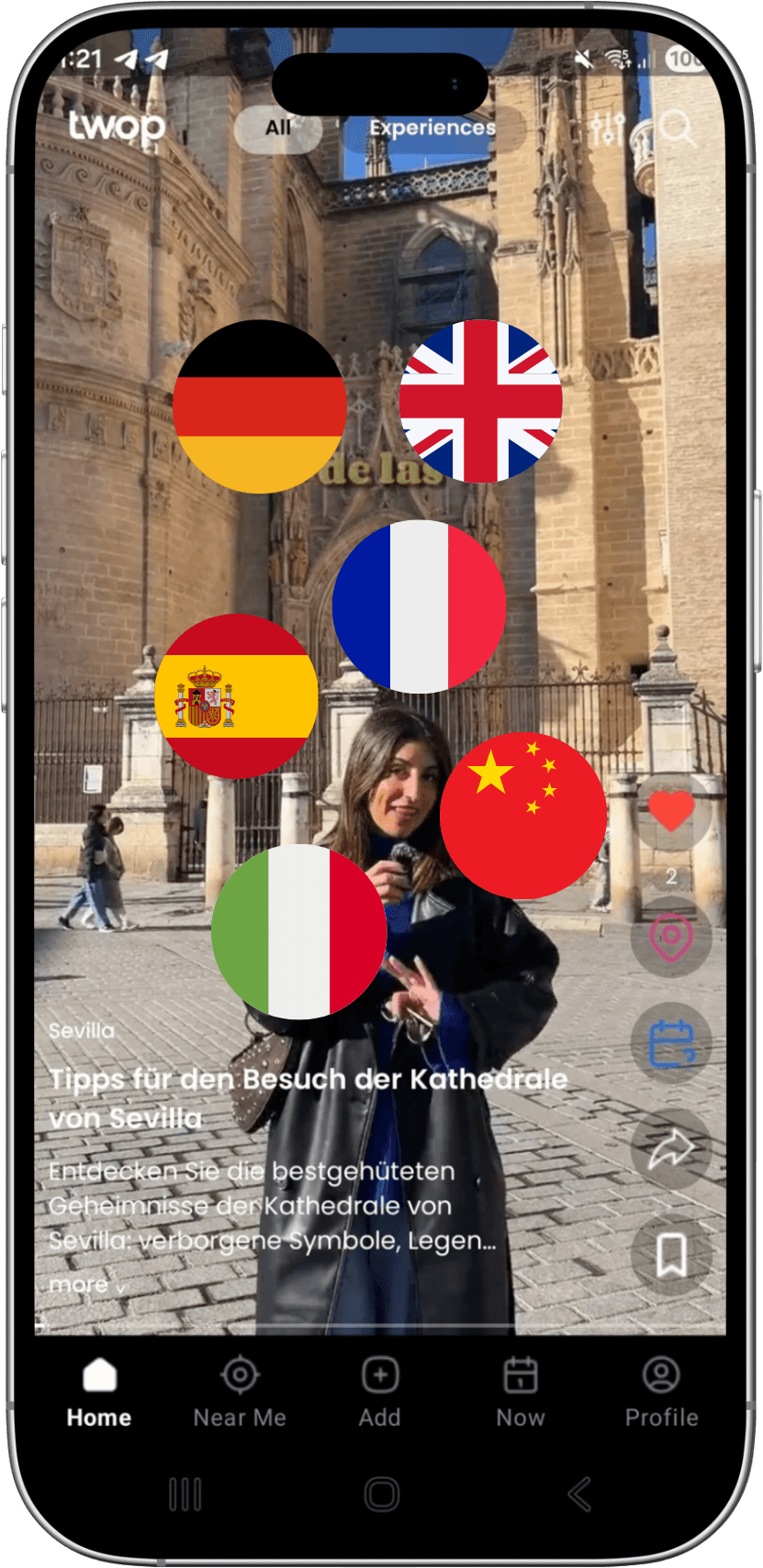 En TWOP, tus vídeos se traducen automáticamente a múltiples idiomas manteniendo el mismo tono y registro del original. Eso significa que tu forma de contar la ciudad —tu conocimiento local, tus detalles y tu estilo— se entiende igual de bien para un viajero de París, Berlín, São Paulo o Tokio.